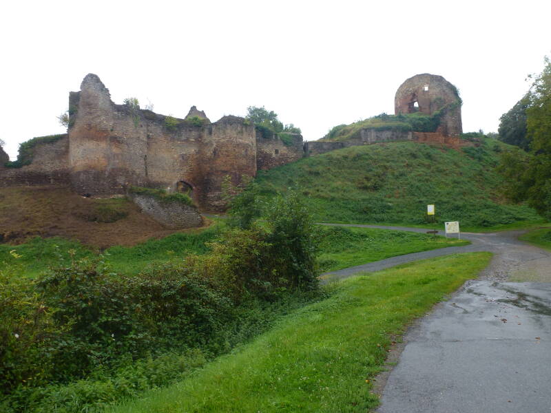 Op km 7 moest ik volgens mijn boekje even halt houden bij de middeleeuwse kasteelhoeve in Sarzay. Bij de laatste bocht in een helling zag ik de indrukwekkende toegangspoort maar ook een grote zwarte hond, die daar voor zat. Die kreeg mij ook in het vizier en snelde al blaffend naar me toe. Een moment dacht ik nog om mijn daser boven te halen (een toestel dat op basis van ultrasoongeluiden bijtgrage honden op afstand houdt), maar dan moest ik van de fiets en dat vond ik op dat moment geen goed idee…Ik heb me dan maar recht gezet en geroepen : ‘weg joeng, weg joeng!’. Maar dat beest verstond natuurlijk geen Nederlands en bleef me enkele honderden meters blaffend volgen. Tot hij het blijkbaar welletjes vond en terug naar zijn strategische zitplaats voor die grote poort ging zitten. Wellicht om een volgende pelgrim de stuipen op het lijf te jagen… Ik versta nu ook beter het begrip ‘hondenweer’: als het regent, zet je de hond buiten…