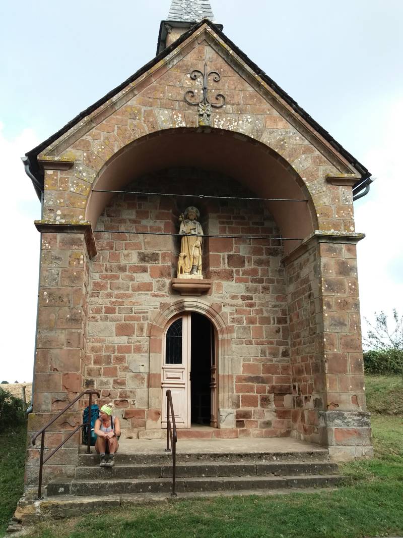Om Conques te verlaten onmiddellijk naar omhoog. Op handen en voeten! 1,5 uur lang. Tot aan een kapel van St-Rochus. De pest moet hier in de Middeleeuwen lelijk huis gehouden hebben, gezien het aantal St-Rochus kapellen...