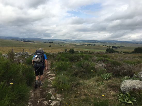Vandaag 20 km door de Aubrac gelopen. Een ongelooflijk mooie streek. Een oneindig uitgestrekte golvende hoogvlakte op 1200 m hoogte van ongerepte natuurlijke grasvelden (prairies), bezaaid met granieten rotsblokken en met honderden grazende runderen. Af en toe een enkele boerderij in grijze bazalt, mooi geïntegreerd in het landschap, waar we kunnen genieten van een lekker stuk taart.
